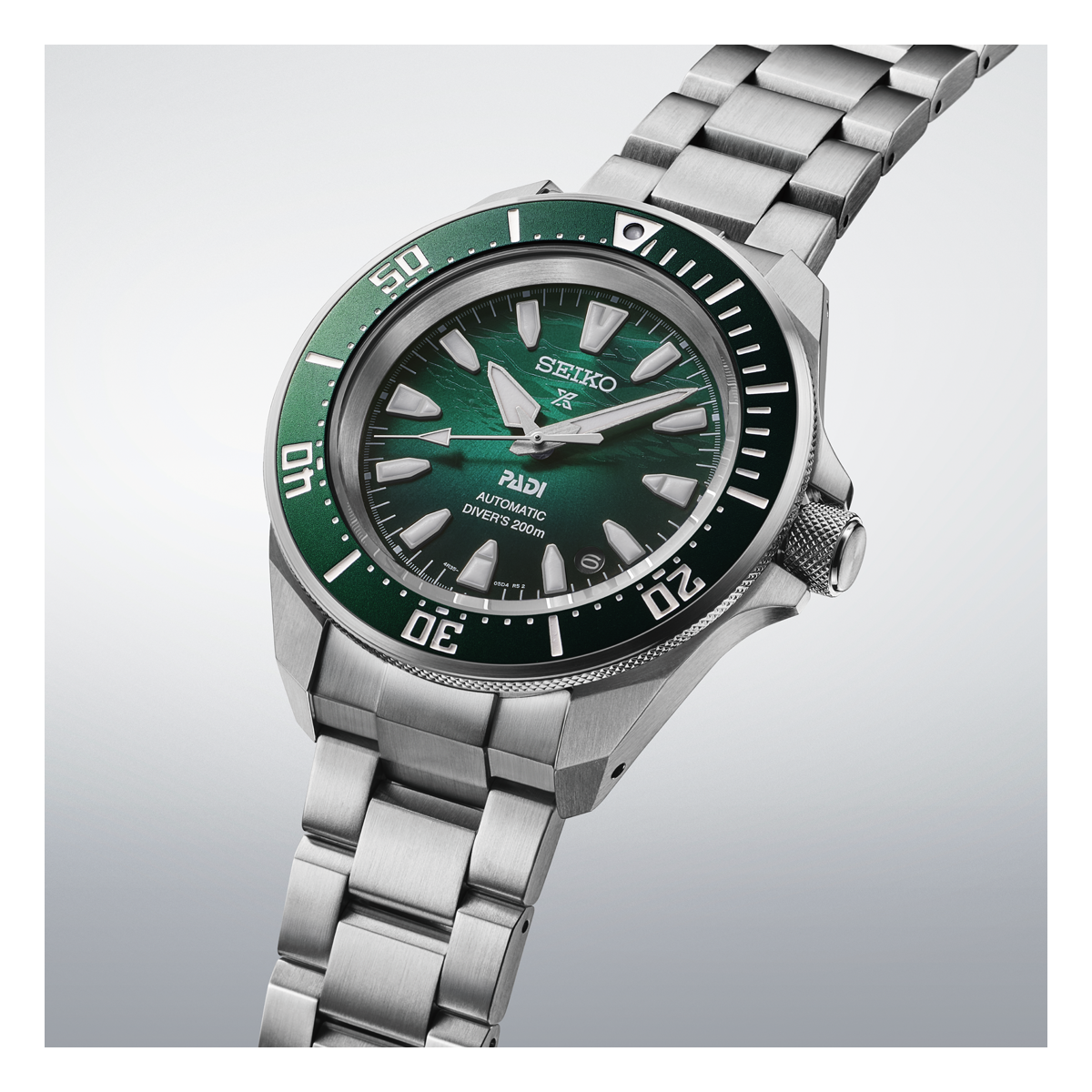 La esfera del SRPL53 se presenta con degradado verde esmeralda inspirada en la luz resplandeciente y la superficie ondulada vista desde debajo del agua., ofrecen una excelente lectura y una estética clásica. Todo ello resguardado por un cristal de Hardlex y enmarcado en una caja de acero inoxidable de 41,7mm. Brazalete tipo pulsera en acero sólido con cierre de tres pliegues con bloqueo seguro, liberación de botón con extensor.