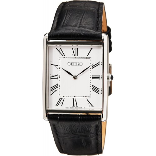 SEIKO SWR107P1 Se trata de un reloj refinado que combina a la perfección el diseño minimalista con la elegancia clásica. Alojado en una compacta caja rectangular de acero inoxidable de 19,6 mm, presume de un perfil delgado con un grosor de sólo 6,1 mm, lo que lo convierte en una opción ideal para aquellos que buscan un accesorio sutil pero sofisticado. El reloj cuenta con una esfera blanca adornada con números romanos y finas agujas negras, todo ello protegido por un cristal de zafiro resistente a los arañazos. Impulsado por el fiable movimiento de cuarzo 4N30 de Seiko, ofrece un cronometraje preciso con una duración de la pila de aproximadamente tres años. La correa de cuero negro, con un ancho de 15 mm y una hebilla ardillón tradicional, garantiza un ajuste cómodo. Con una resistencia al agua de 5 bar (50 metros), el SWR107P1 es adecuado para el uso diario, incluso bajo la ducha. Este reloj ejemplifica el compromiso de Seiko con la calidad y la artesanía, ofreciendo un accesorio versátil y atemporal para cualquier ocasión.