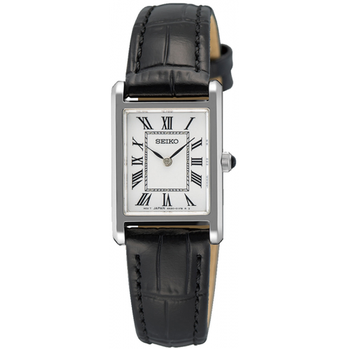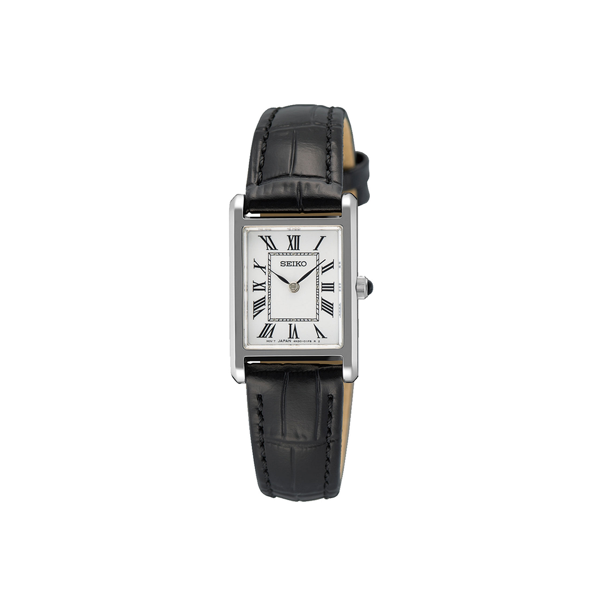 Reloj Seiko SWR103P1 para mujer con caja rectangular de acero inoxidable de 27.2 mm, esfera blanca con números romanos, cristal de zafiro y correa de cuero de vaca. Sumergible 50 metros. Movimiento de cuarzo japonés.