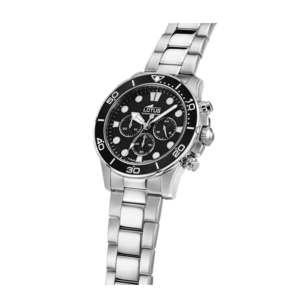 Reloj Lotus Hombre 18756/3 Acero. Caja de acero inoxidable de 44,5mm de diámetro. Brazalete de acero inoxidable con cierre plegable. Esfera negra con índices y agujas plateadas y luminiscentes. Bisel de acero negro. Cronómetro. Función 3 agujas. Analógico. Quartz. Sumergible 100m