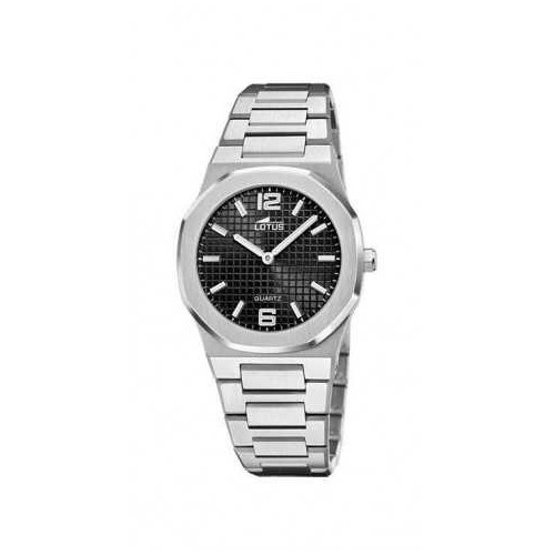 Reloj Lotus Mujer 18843/4 Acero. Caja de acero inoxidable de 32,5mm de diámetro. Brazalete de acero inoxidable con cierre oculto. Esfera negra con índices y agujas plateadas y luminiscentes. Bisel de acero inoxidable. Analógico. Quartz. Sumergible 50m.