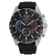 esfera en negro con esferas del cronógrafo en azul y rojo con aguja crono en rojo
