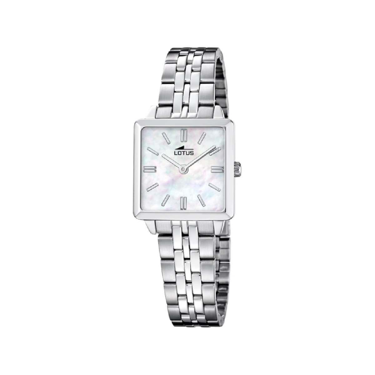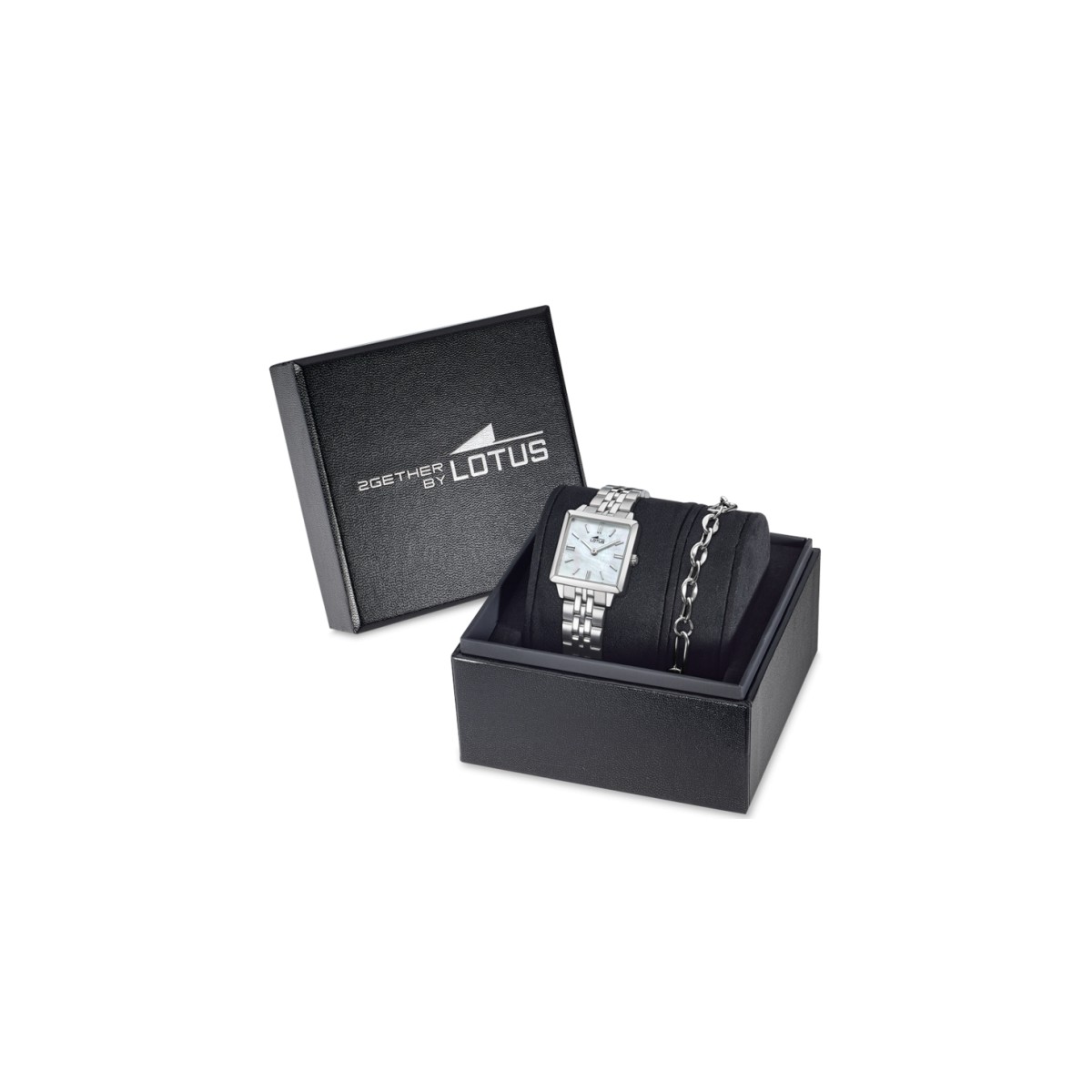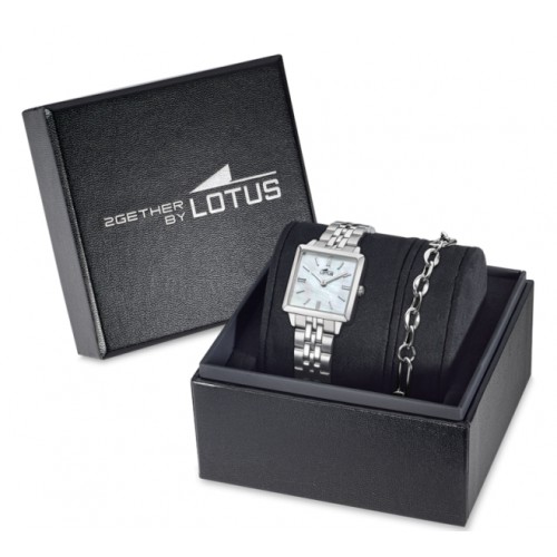 El Lotus 2GETHER 19010/1 ofrece una esfera en nácar dentro de una caja cuadrada de acero inoxidable, reflejando un estilo clásico y atemporal. Se acompaña de pulsera a juego en una refinada caja regalo, un conjunto perfecto para celebrar momentos únicos.