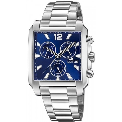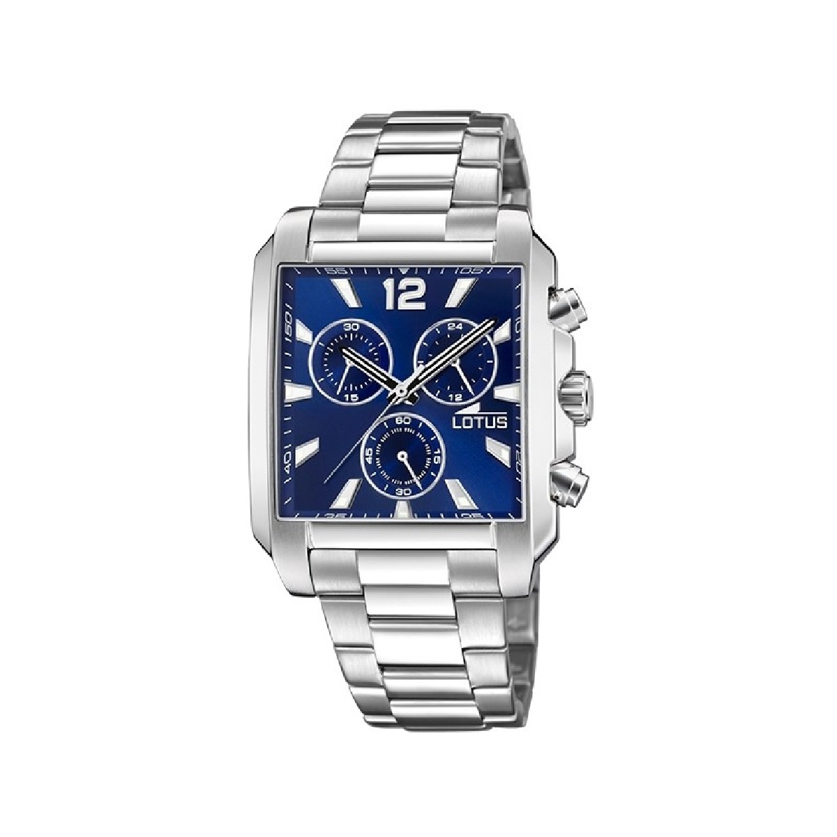 Este reloj Lotus Square 18850/2 de 38 mm presenta una esfera cuadrada de color azul, la esfera azul resalta las agujas y los índices, ofreciendo un contraste atractivo además tanto los índices como las agujas tienen tratamiento luminiscente.