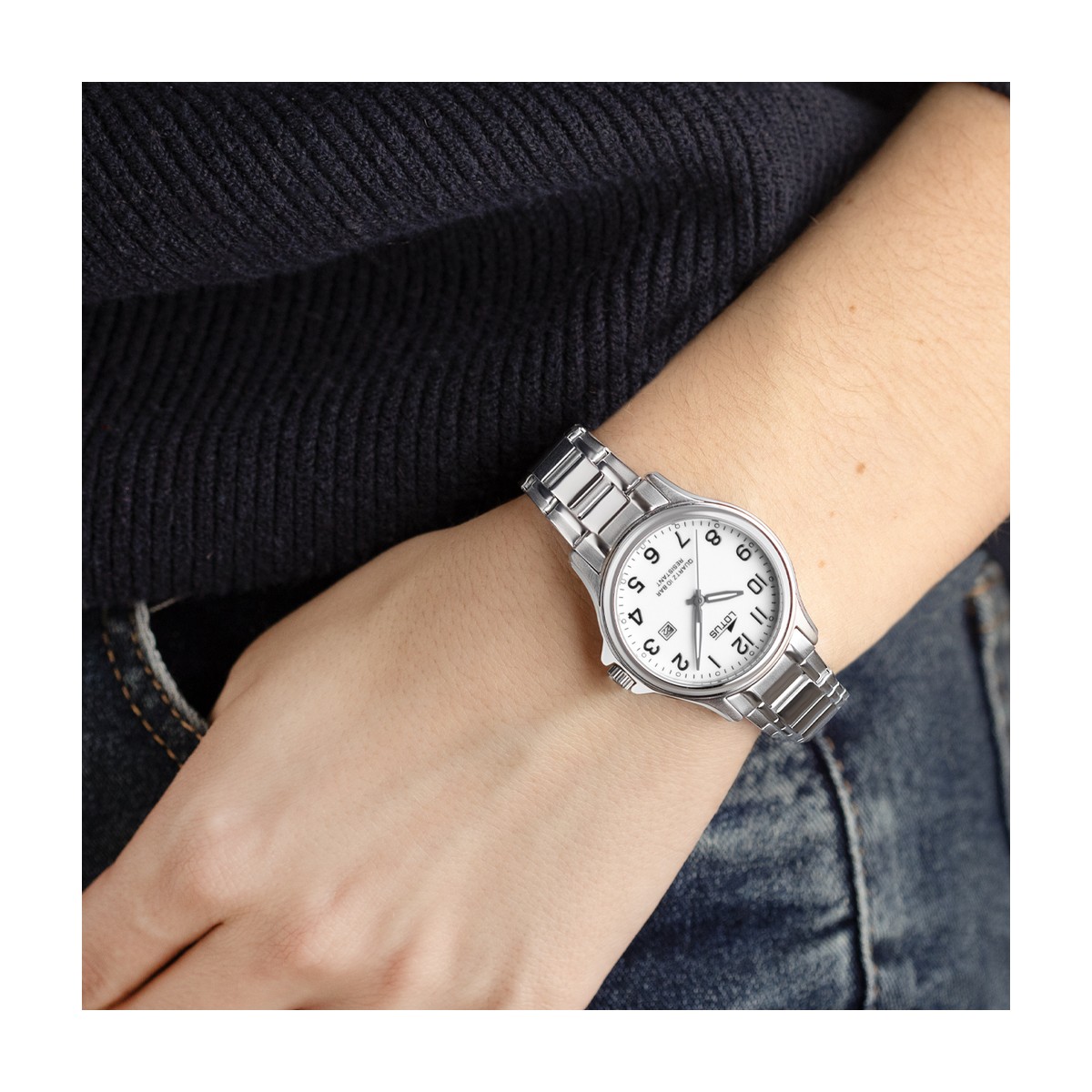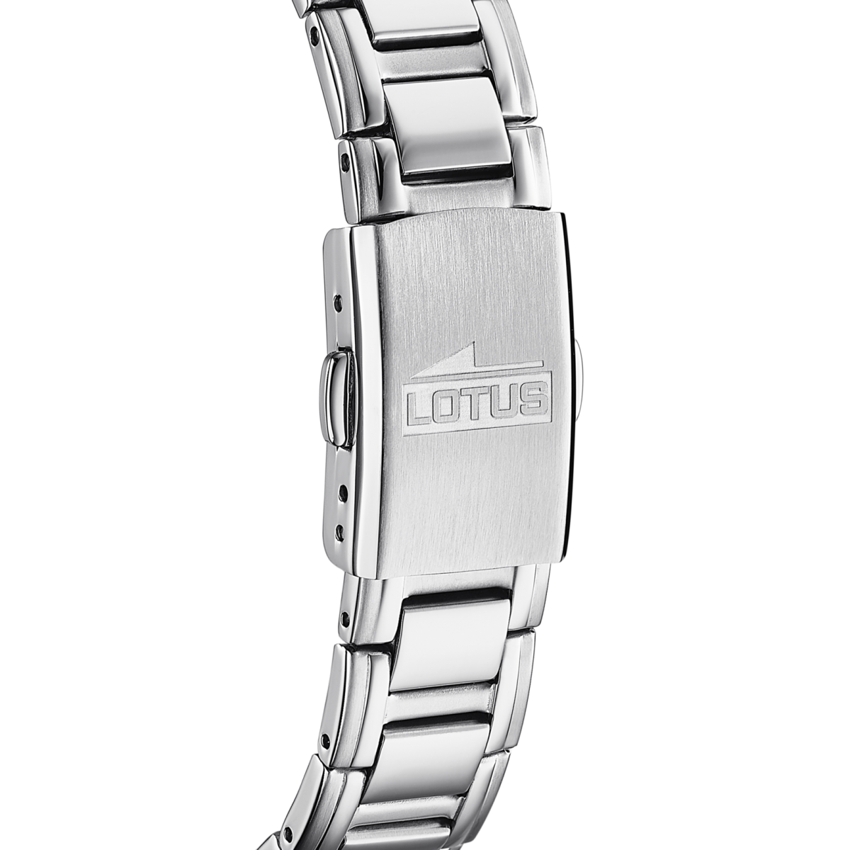 Reloj Analógico de Lotus para mujer fabricado en acero inoxidable. Estamos ante un reloj de estilo puramente clásico y elegante con caja de acero inoxidable de 32,5 mm de diámetro, esfera blanca con agujas luminiscentes y movimiento analógico de cuarzo protegido por cristal mineral. Su correa de acero inoxidable está compuesta por eslabones y su cierre es desplegable. Resistente al agua hasta 100 metros.