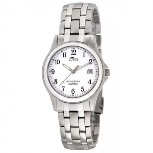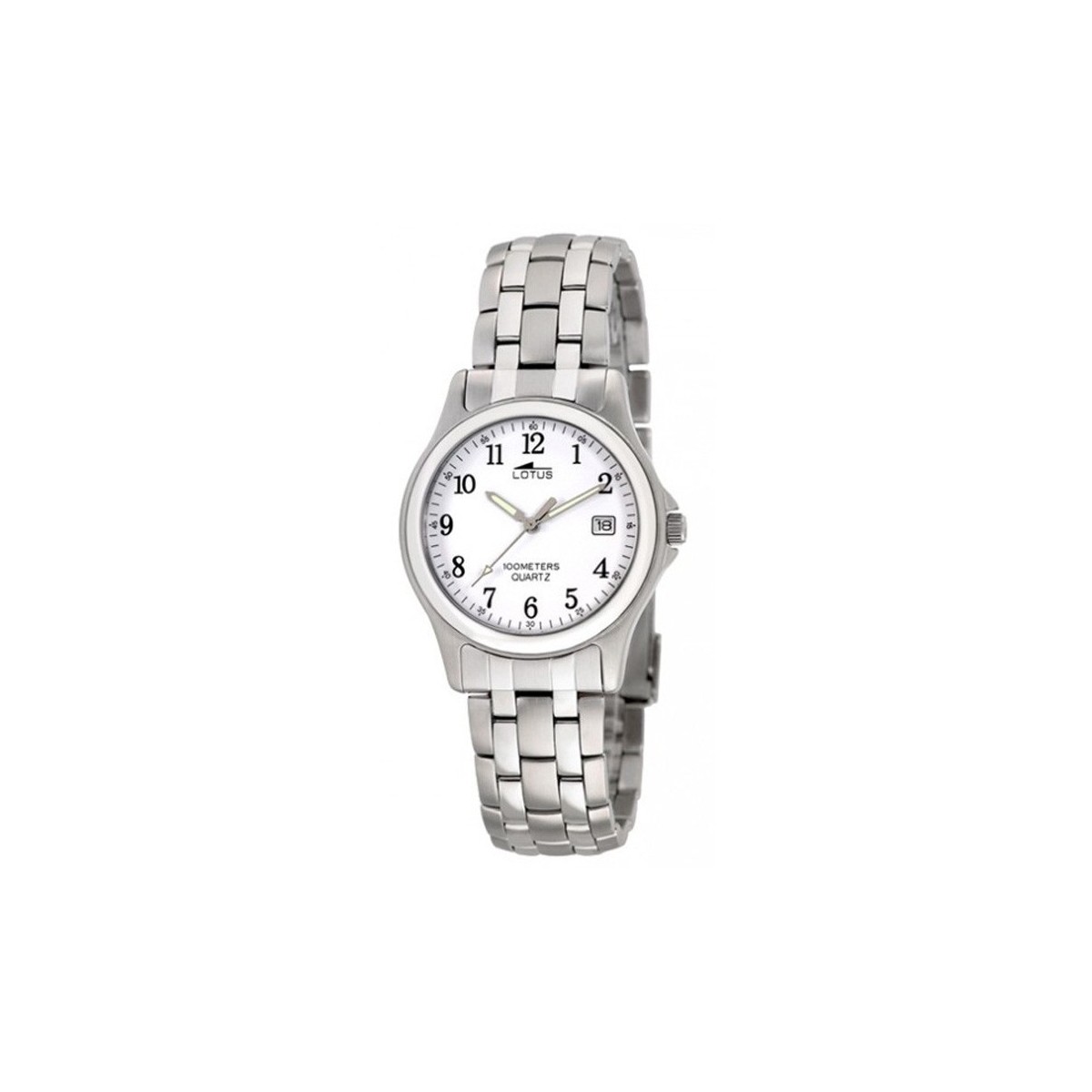 Reloj Lotus de caballero, en acero caja y brazalete, números árabes, calendario a las tres, agujas luminiscentes. Resistente al agua 100 metros.