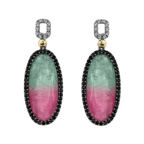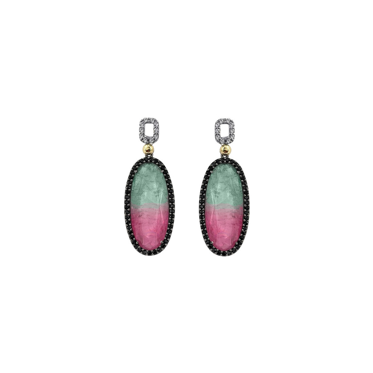 PENDIENTES DE PLATA Y ORO CON CRUAZO TURMALINA BICOLOR, ESPINELAS NEGRAS Y ZAFIROS BLANCOS