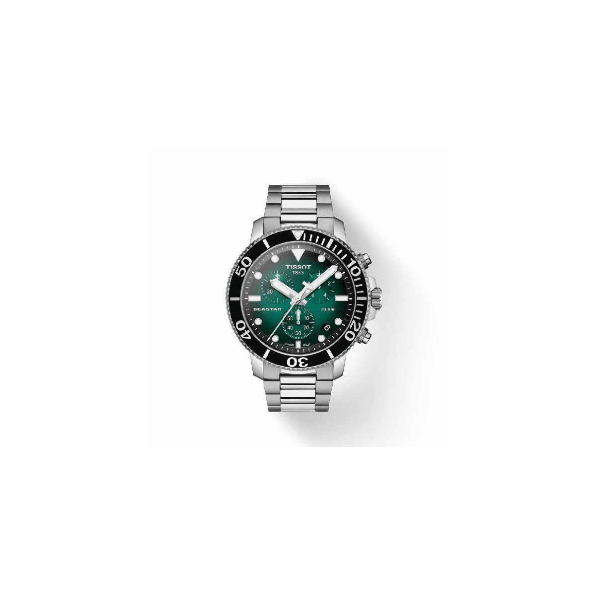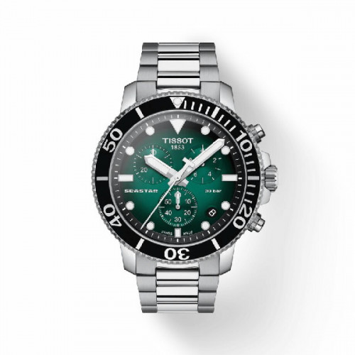 Reloj Tissot de la colección Seastar, en acero caja y brazalete, caja redonda con esfera en color verde degradado, resistente al agua 300 metros.
