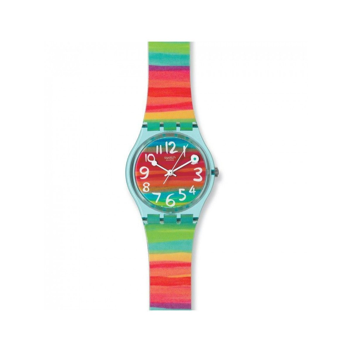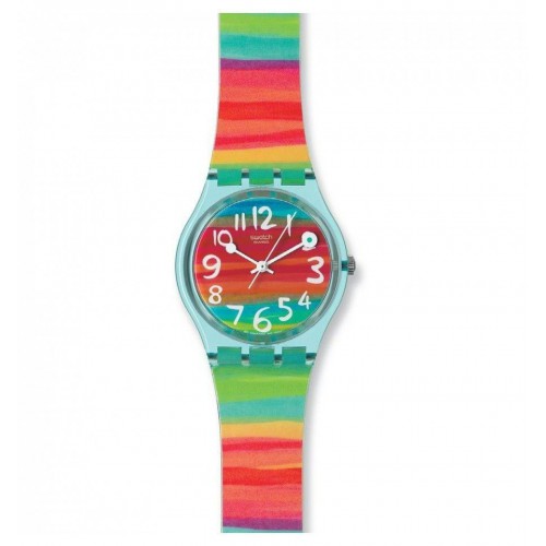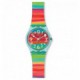 Reloj Swatch Color The Sky GS124 con movimiento de cuarzo analogico, caja de plastico de 34mm de diametro, correa multicolor de silicona, cristal plex, esfera multicolor y sumergible 3 ATM.