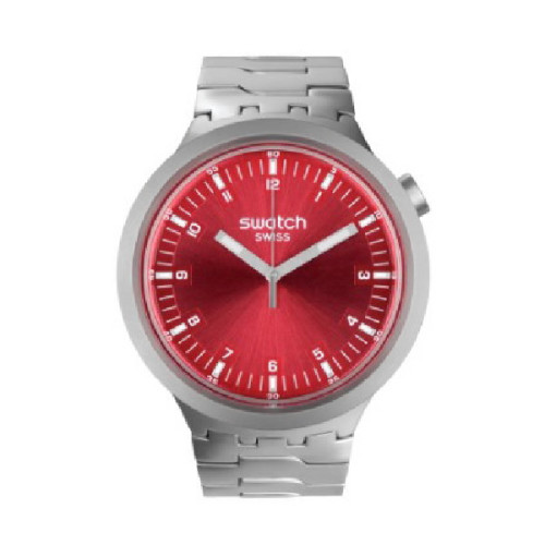 Reloj extragrande de acero inoxidable presenta una esfera color burdeos con acabado cepillado al sol, estampado blanco y agujas grises que brillan en la oscuridad. Una pulsera ajustable de acero inoxidable y la caja y el bisel arenados complementan la gran esfera de este reloj.