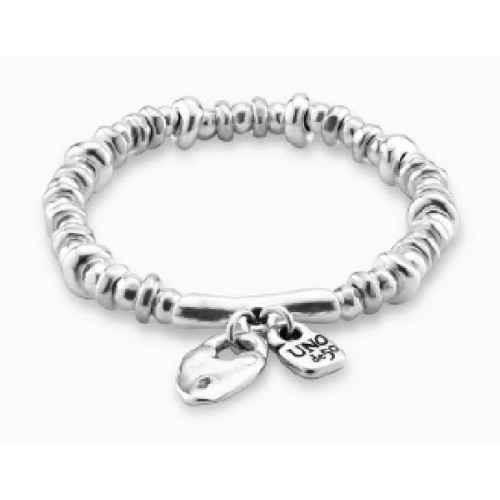 Pulsera elástica compuesta por múltiples piezas bañadas en plata y una tubular de la que cuelgan el clásico candado de la marca y otro en forma de corazón.